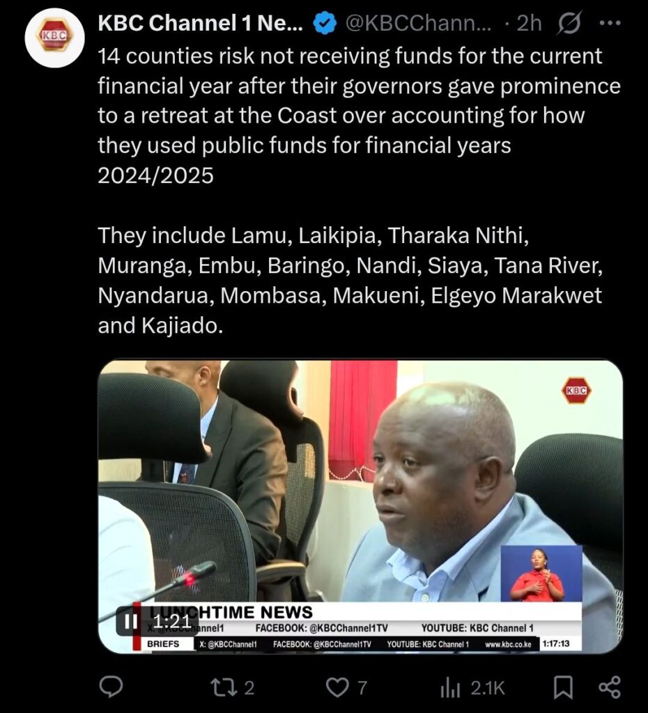 According to KBC Channel1 through their official X account, the governors of these counties reportedly prioritized a retreat at the Coast over fulfilling mandatory accounting and reporting obligations for how they utilized public resources.