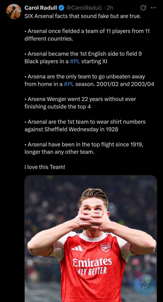 Sports journalist Carol Radull recently shared a passionate X post highlighting six Arsenal facts that “sound fake but are true,” ending with her declaration of love for the club.