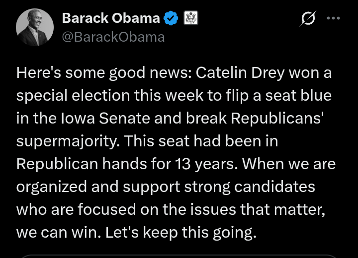 “Here’s some good news: Catelin Drey won a special election this week to flip a seat blue in the Iowa Senate and break Republicans’ supermajority,” Obama wrote.