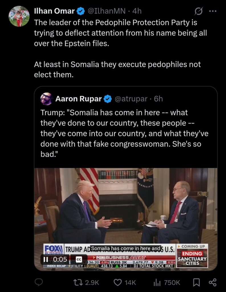 The remark came in response to Trump’s recent Fox Business interview, where he disparaged Somalia and referred to Omar as “that fake congresswoman,” blaming her and Somali immigrants for issues affecting the U.S.