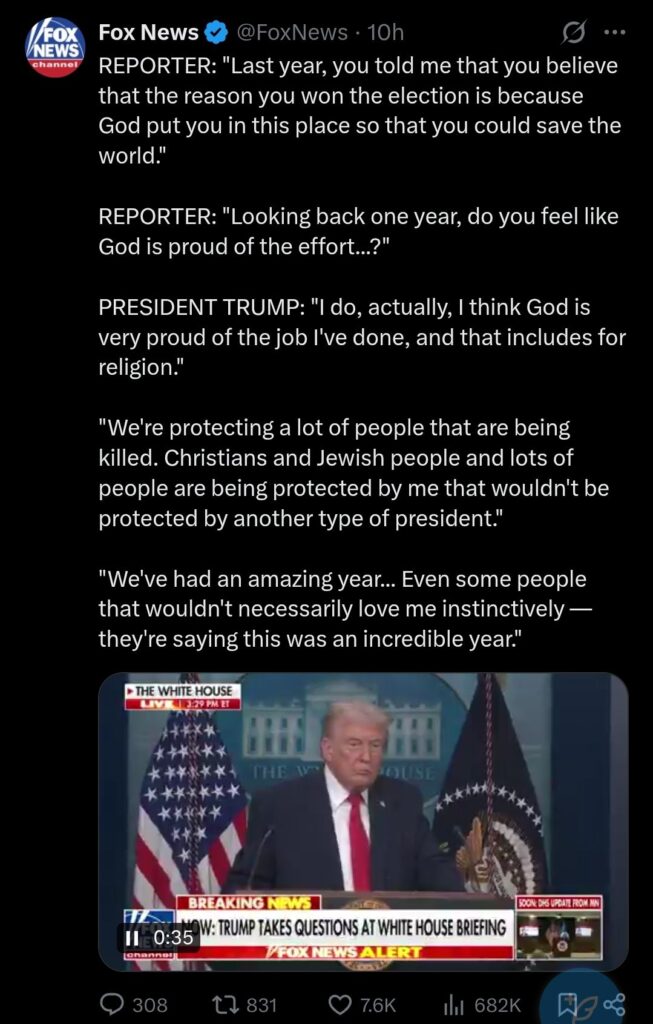 As with many of Trump’s statements, the comments have drawn mixed reactions. Supporters see them as affirmation of strong, values-driven leadership, while critics argue they reflect self-aggrandizement and blur the line between personal belief and public office.