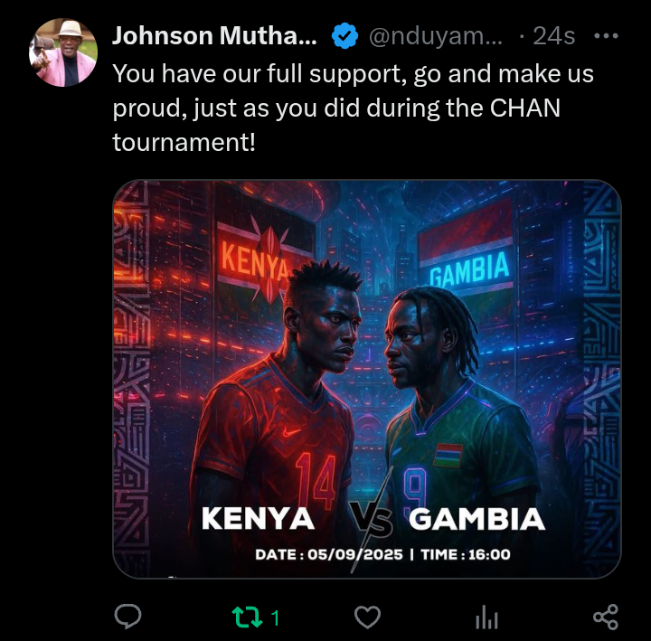 “You have our full support, go and make us proud, just as you did during the CHAN tournament!” Muthama wrote, attaching a promotional graphic of the Kenya vs Gambia showdown scheduled for September 5, 2025, at 4:00 p.m.