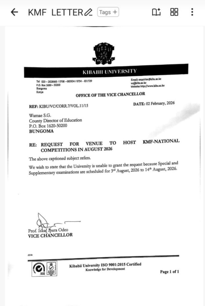 In an official letter dated February 2, 2026, from the Office of the Vice Chancellor, Prof. Isaac Ipara Odebe informed Wamase S.G., the County Director of Education in Bungoma, that the university cannot provide venue facilities for the event.
