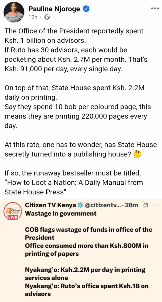 Her reaction follows revelations flagged by the Controller of Budget (COB), which reported that President William Ruto’s office spent billions on advisors and daily printing services.