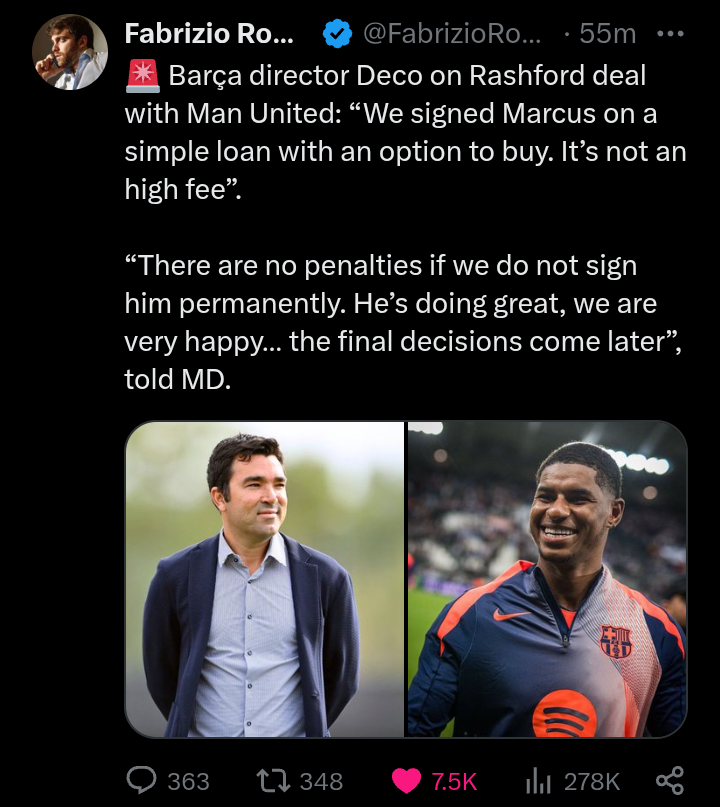 Speaking to Spanish outlet Mundo Deportivo, Deco confirmed that Rashford joined Barcelona on a simple loan agreement with an option to buy, stressing that the financial terms of the deal are favorable to the Catalan giants.