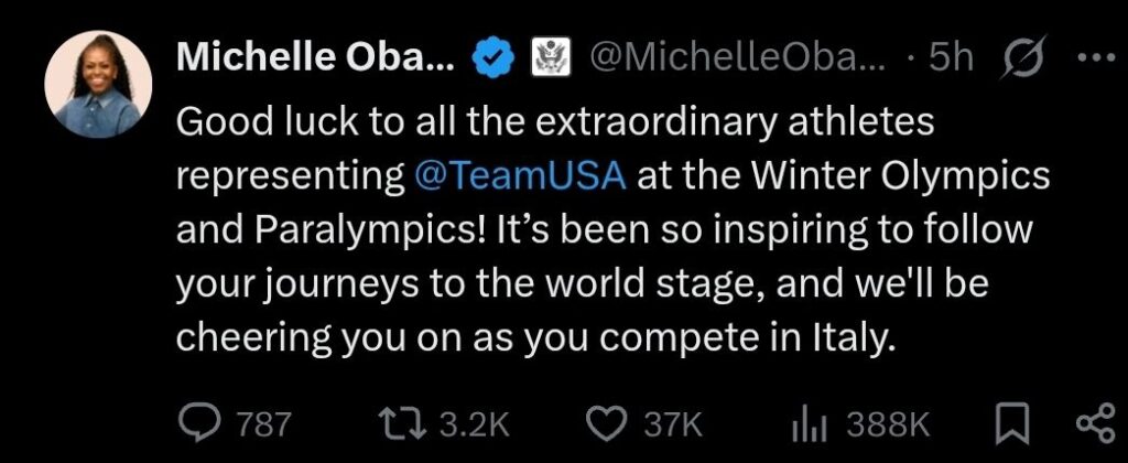 “Good luck to all the extraordinary athletes representing @TeamUSA at the Winter Olympics and Paralympics! It’s been so inspiring to follow your journeys to the world stage, and we’ll be cheering you on as you compete in Italy,” said MichelleObama.
