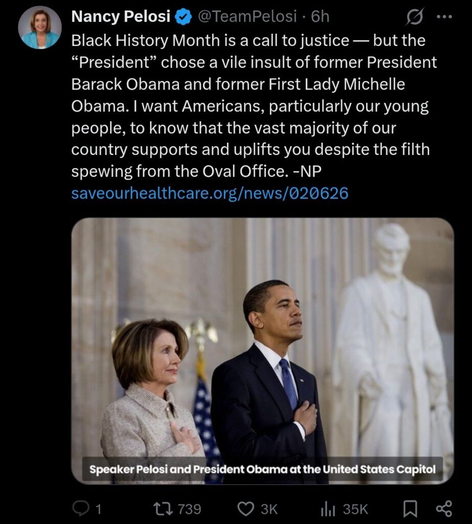 Through her official X account, Pelosi sharply condemned President Donald Trump as she dropped a message about Black History Month.