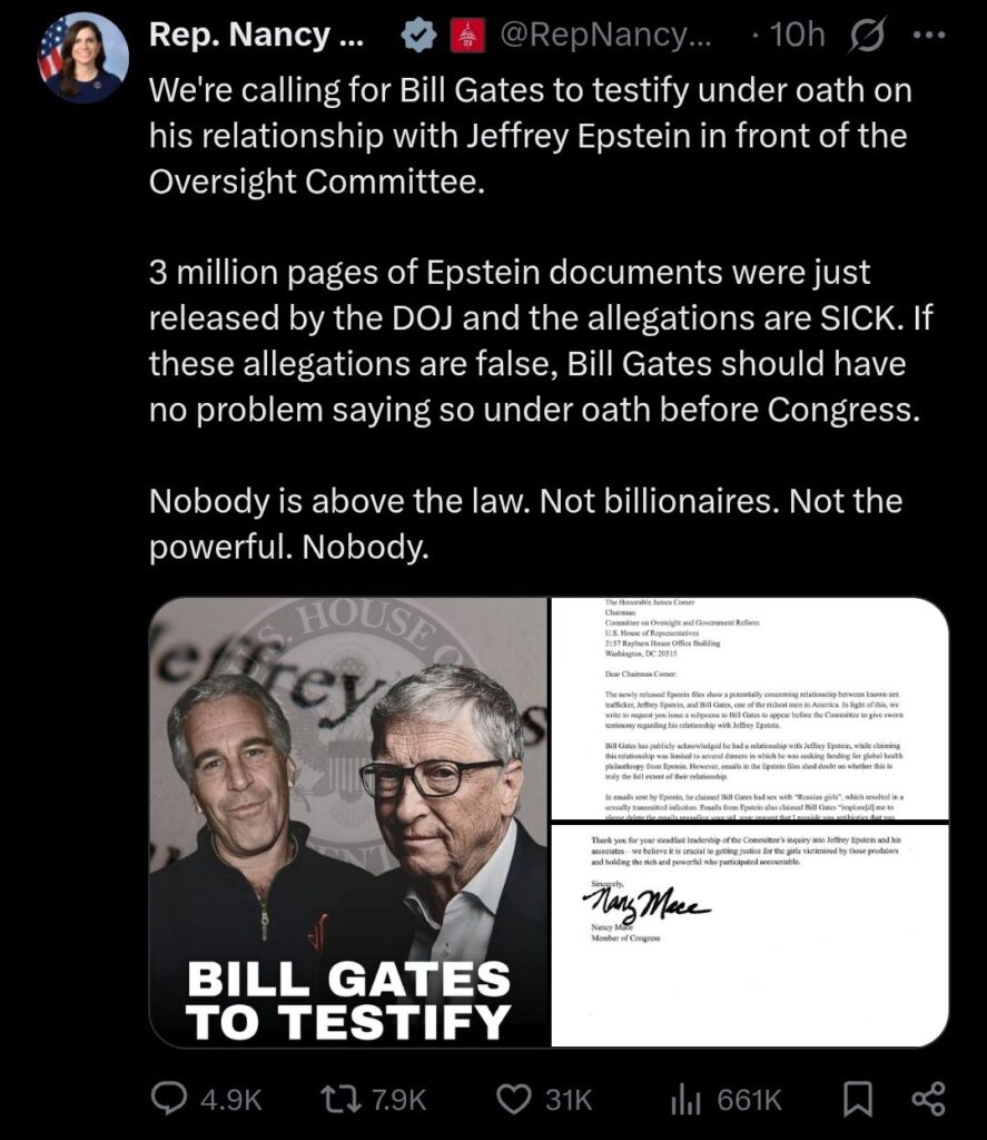 U.S. Representative Nancy Mace (R-SC) has publicly demanded that Microsoft co-founder Bill Gates testify under oath before the House Oversight Committee regarding his relationship with the late convicted sex offender Jeffrey Epstein.