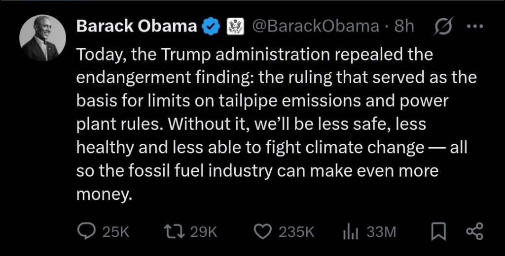 Obama’s post, which garnered significant engagement, underscores the deep partisan divide on climate policy in the U.S. The repeal paves the way for further rollbacks on emissions rules, though legal challenges from states and groups are expected.