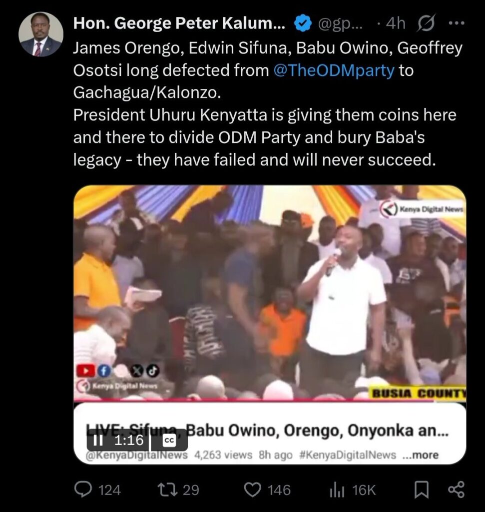 George Peter Kaluma, a vocal Kenyan MP, accused prominent Orange Democratic Movement (ODM) leaders—James Orengo, Edwin Sifuna, Babu Owino, and Geoffrey Osotsi—of having long defected from the party to align with the Gachagua/Kalonzo faction.