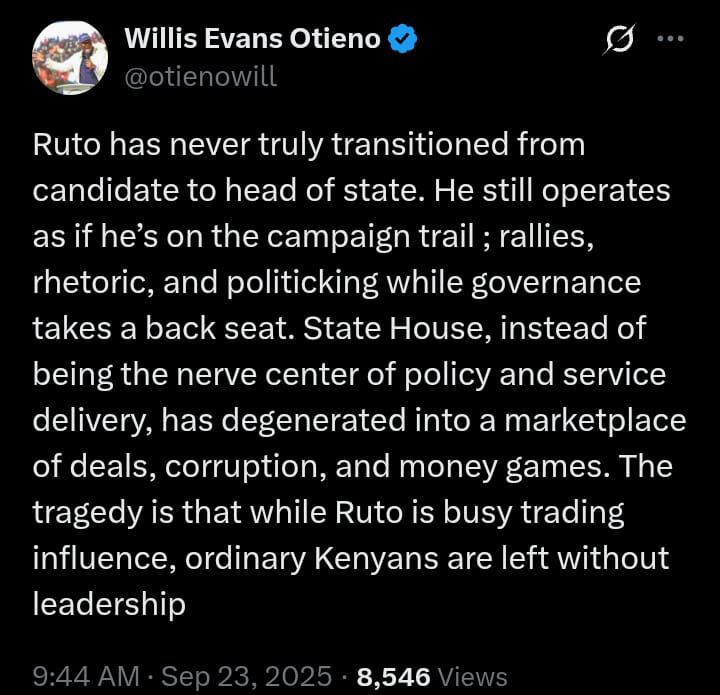 Through his official X account, Otieno argued that since taking office, Ruto has continued to operate as though he were still on the campaign trail, prioritizing political rallies, rhetoric, and constant politicking over actual governance.