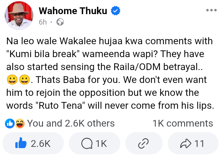 “Na leo wale Wakalee hujaa kwa comments with ‘Kumi bila break’ wameenda wapi? They have also started sensing the Raila/ODM betrayal,” Thuku wrote, hinting at changing political dynamics.