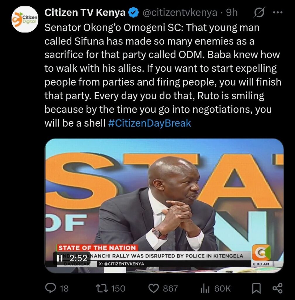 Senator Okong’o Omogeni, appearing on Citizen TV’s DayBreak, passionately defended ODM Secretary General Edwin Sifuna amid growing internal tensions within the party.