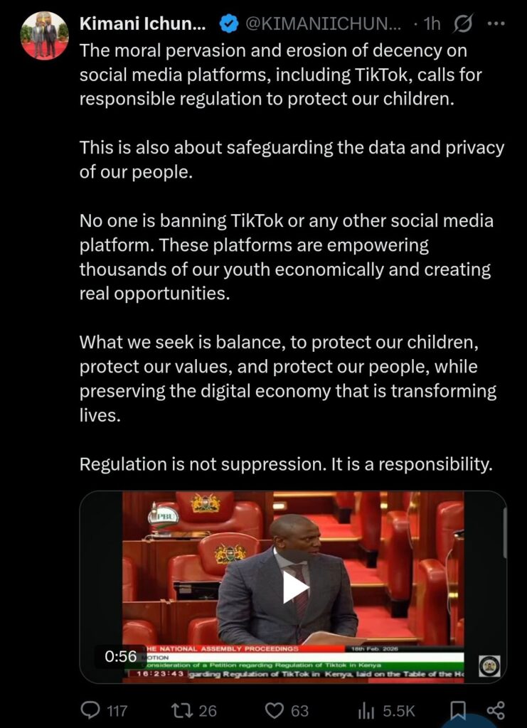 National Assembly Majority Leader Kimani Ichung’wah addressed concerns over TikTok, emphasizing that no outright ban is planned for the platform or other social media apps.