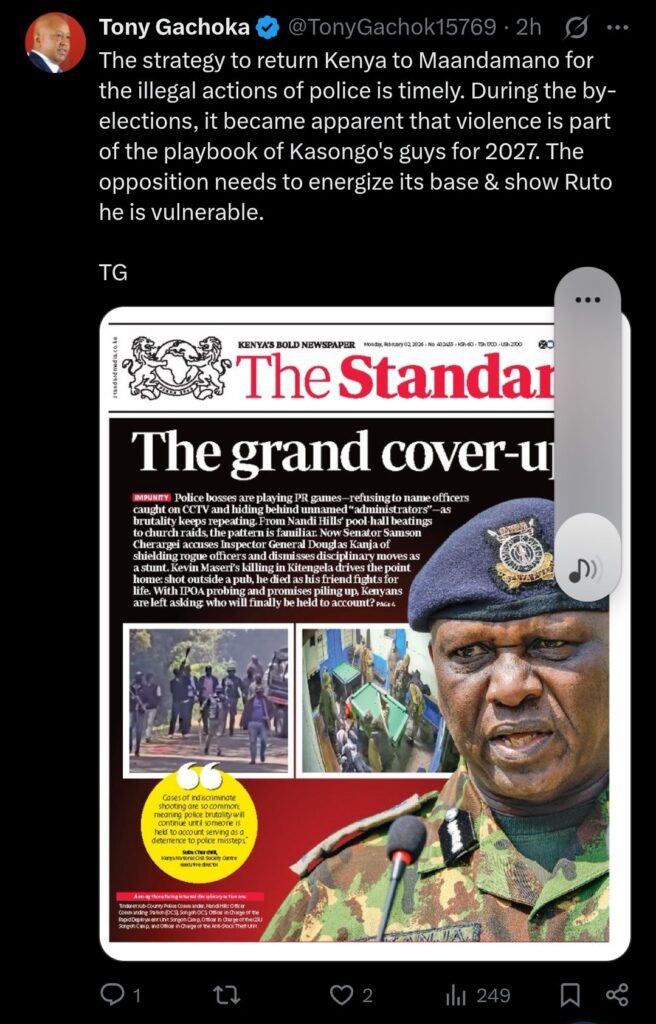 Today, through his official X account, he highlighted a growing frustration with alleged police misconduct in Kenya, linking it to a broader strategy to revive Maandamano (protests) ahead of the 2027 elections.
